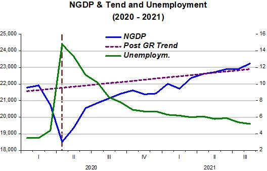 When Covid19 hit in early 2020, money demand skyrocketed (velocity tanked) and unemployment went very quickly (not over several months as in 2008/09) to almost 15%. The Fed reacted (it was not the cause of the shock) quickly, and NGDP was soon travelling back to the trend level path it was on before the pandemic.