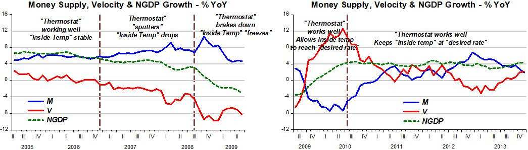 The working of the “Thermostat” for different times are annotated on the charts. Note that when the “fireman” “took oil out of the furnace” when the outside temperature dropped, the “inside temperature” “froze”! When the “outside temperature” (V) began to rise, the Fed was “smart” enough not to fully offset it, allowing the “inside temperature” (NGDP growth) to rise to the Fed´s “desired rate”, where it was maintained thereafter.