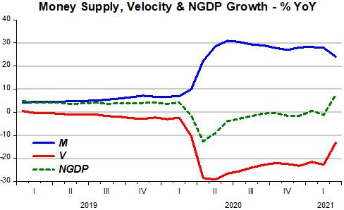 When the pandemic hit, there was a sudden and abrupt fall in V. The “fireman” (Fed) was “shockingly surprised”, but quickly reacted by throwing oil into the furnace to stop the “inside temperature” from dropping even more and rapidly was pushing it up. According to the latest available information (March), since the Fed wants to get the “inside temperature” up, it is far from fully offsetting the rise in the “outside temperature” (V).