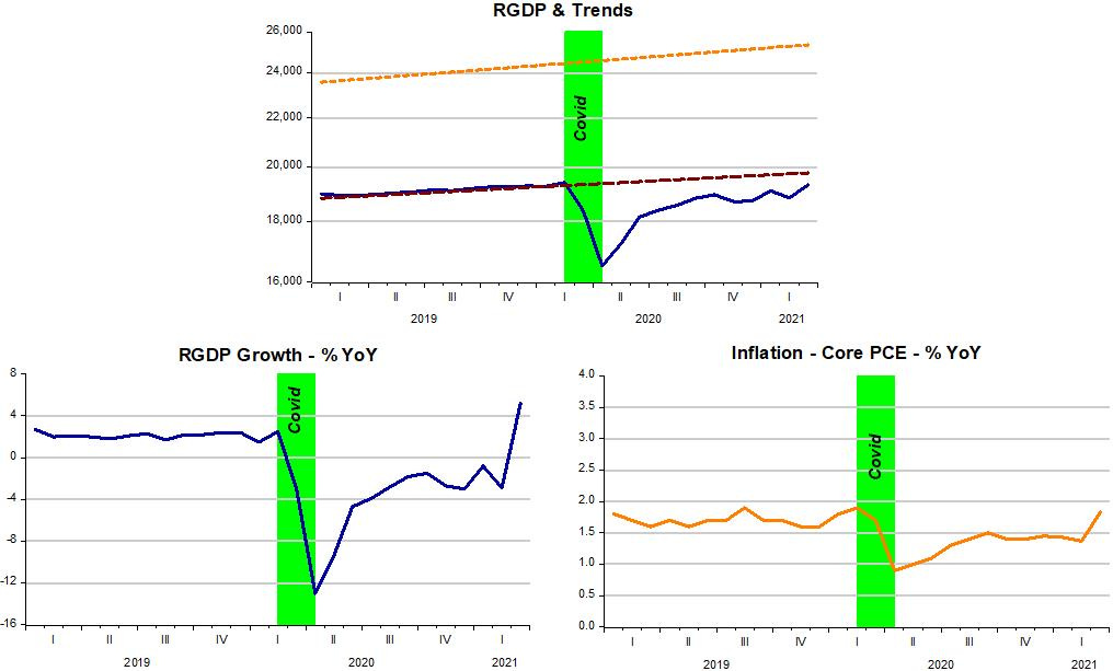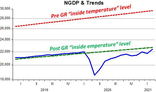 What´s the situation at present? With the Fed “cranking-up” the “thermostat”, with M not fully offsetting the rise in V, as we saw above, the “inside temperature” is warming up. As I write, it could be that the level of RGDP has hit the previous trend level path.