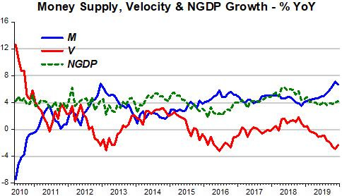 The chart below, provides a nice empirical illustration of the “Thermostat” at work. During the 10 years following the end of the “Great Recession” (GR), NGDP growth (“inside temperature”) was quite stable (this can also be verified for the 20 years during the “Great Moderation” (GM)). During this time, M and V are negatively correlated. That´s what a good “thermostat” (monetary policy) is supposed to do to keep the “inside temperature” (NGDP growth) stable.