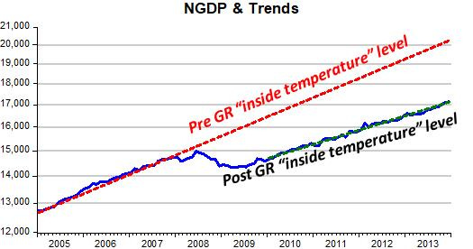 The corresponding “temperature level” chart for the whole 2005-2013 period is instructive. When the “inside temperature” (NGDP growth) “froze”, the “inside temperature level” dropped. Thereafter, while it allowed the “inside temperature” to rise, the “inside temperature level”, never got as “warm” as it was before the “thermostat” began to sputter. This contrasts with what we see at present, where the “inside temperature level” is almost back to the post GR “inside temperature” level!