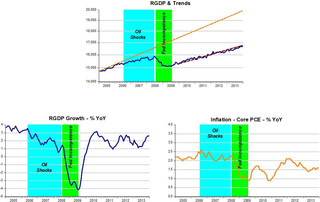 What was the breakdown of the “inside temperature” (NGDP growth) during the GR and its aftermath? I highlight two periods; the oil shocks and what I call “Fed Incompetence”. That “incompetence” refers to the mismanagement of the “Thermostat” (monetary policy), allowing the economy to “freeze-up”.
