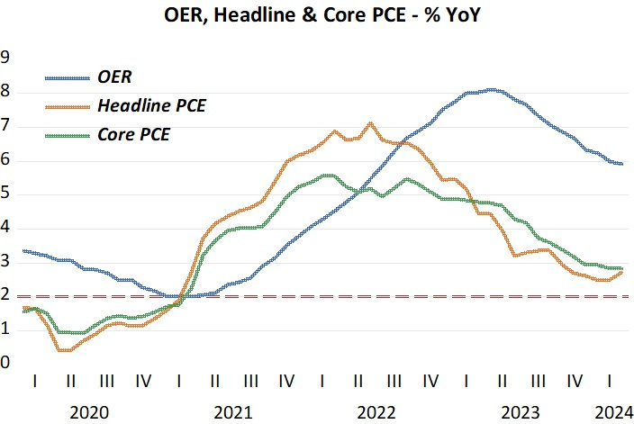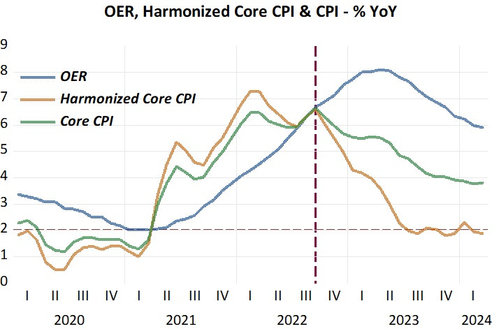 Note that when OER takes off after September 2022, the difference between CPI inflation and the harmonized version increases. Since mid-2023, the Core CPI has flutuated narrowly around 2%, the Fed´s target for inflation. Given the still high (even if falling) increase in OER, the difference between the CPI and the Harmonized version remains high.