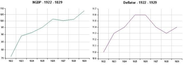 Krugman doesn´t mention monetary policy much. After all we are in his “beloved” liquidity trap (and Bernanke is not “manly” enough to increase inflation expectations). Johnson says the “roaring 20s” was all due to “slashing taxes, government spending, etc.” Not a word on monetary policy. But let´s look closer.