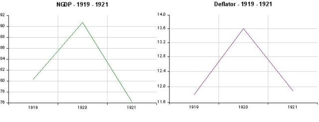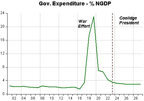 “Fiscalists” will say that the 1920-21 recession was due to government expenditure falling from 23% of NGDP in 1919 to 7% in 1920.The problem is that they continued to fall reaching 3.2% in 1924 and averaging 3% from then until 1929, but the economy rebounded smartly.