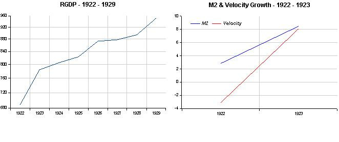 From 1924 onwards nominal and real growth fall back to 3.3% on average with prices stable. In 1927 monetary policy failed to compensate the fall in velocity. Real growth dropped close to zero and there was a slight deflation.
