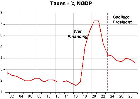 Figure 2 shows that just as taxes had had gone abruptly and sharply to finance the war effort, they just as sharply came down after the war. By the time Coolidge became president all the “work” was already done. But notice that taxes didn´t fall to the pre war level.