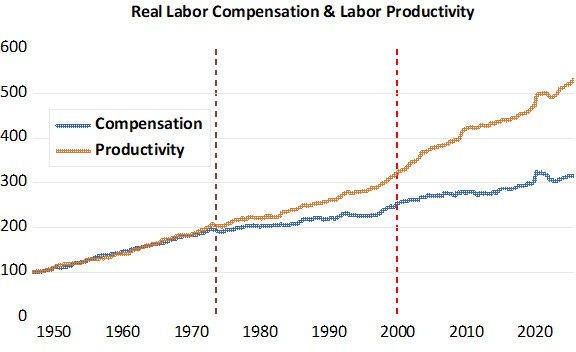This disconnect accelerated in the 2000s as automation and offshoring reduced labor’s bargaining power while increasing returns to capital. A Tesla factory produces more value per worker than a 1970s GM plant, but workers capture less of that value while Elon Musk captures more.