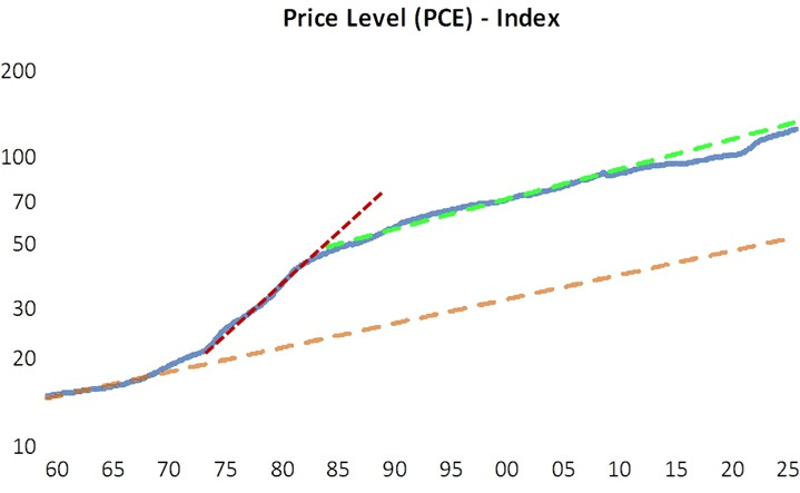 Following the Volcker adjusment in the early 1980s, inflation went back to the rate that prevailed in the 1960s, so that the price level trend was the same (the green dotted line has the same slope as the brown dotted line). Obviously, the price level itself was higher.