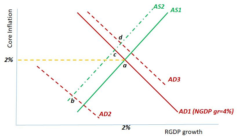 Over time, monetary policy was sufficiently expansionary to take the economy from point b to point c. If the Fed had stopped there it would have gotten an A for a stellar job done. Unfortunately it went “overboard”, increasing AD to point d. With that mistake, inflation was pressured.