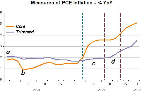 The two charts above tell us that the the Fed did a stellar job, since by March 2021, just 13 months after the February 2020 peak, it had engineered a full recovery of the economy (c) given the supply constraints present. Between July and October 2021, however, it erred by adopting an overly expansionary monetary policy (d).
