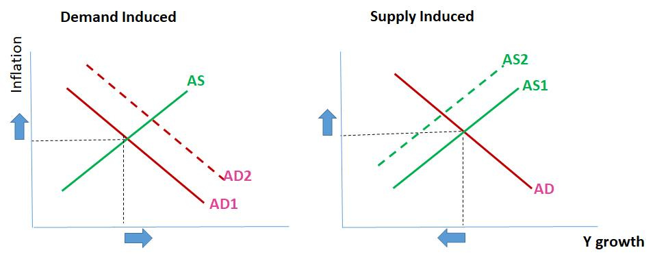 If inflation rises because of a demand shock, real output growth will move in the same direction. When inflation rises due to a supply shock, inflation rises and real growth falls.