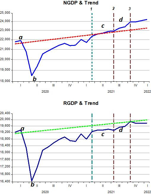 The Fed´s mistake took the economy to area d. The resulting increase in NGDP growth increased both inflation and RGDP (as the dynamic AS/AD model predicts). So now, the Fed has to make a choice. Should it immediately “correct” its mistake and adopt a contractionary monetary policy (shift the AD curve from AD3 to AD1 in the stylized pandemic chart above), which would reduce the level of NGDP back to trend in the “real world counterpart chart”, thus reducing that part of inflation due to the demand shock, or should it keep NGDP “constant” at the present level, allowing the “demand induced” inflation to fall more slowly?
