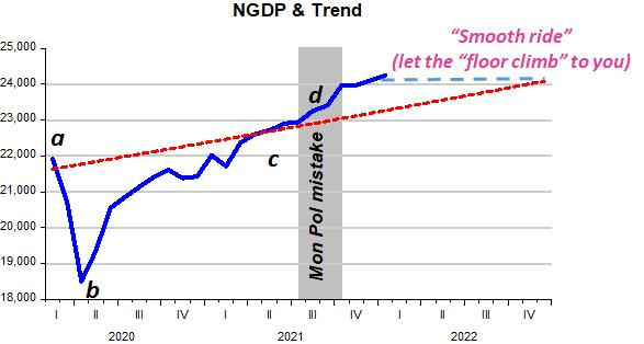 If monetary policy had remained “neutral”, all would be well! The rise in inflation was unavoidable anyway and the best monetary policy could have done was to keep NGDP on trend. With the waning of the supply restrictions, the AS curve would shift down and to the right and the economy would converge to point a on the stylized chart of the pandemic shown earlier. A very “soft landing” would have taken place!